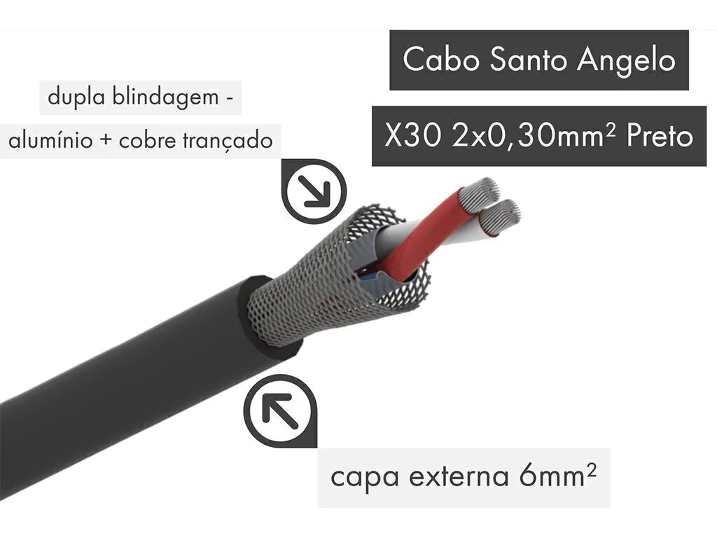 - Cabo Santo Angelo X30 balanceado com condutor e blindagem fabricado em cobre estanhado OFHC (isento de oxigênio), bitola 0,30mm², Ø 6.0mm, estéreo
