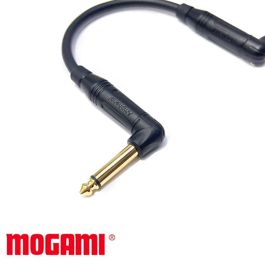 Patch-cable para interconexão de pedais de efeito montado com cabo Mogami W2549 preto e conectores Amphenol ACPM-RN-AU banhados a ouro com corpo prata em formato "L".