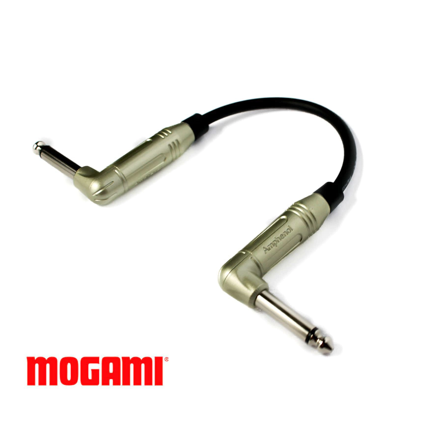 Patch-cable para interconexão de pedais de efeito montado com cabo Mogami W2319 preto e conectores Amphenol ACPM-RN-GN niquelados com corpo prata em formato "L".
